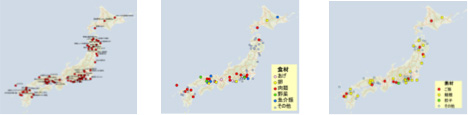 以上の分析結果を元に、B-1グランプリで上位入賞した全国のB級グルメを調べ、人気のB級グルメに共通する要素をまとめた。岡山市内の4ヵ所の地域に注目し、そこの名産の食材を使用した岡山のB級グルメを開発しようと考えた。